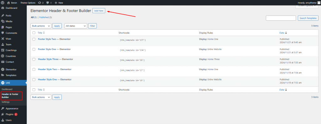 Go to Dashboard, then navigate to UAE > Header & Footer Builder. Click on ‘Add New’ and select the type of template header then publish it