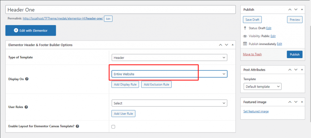 2. If you want the header to appear on the entire website, select the “display condition entire website.”