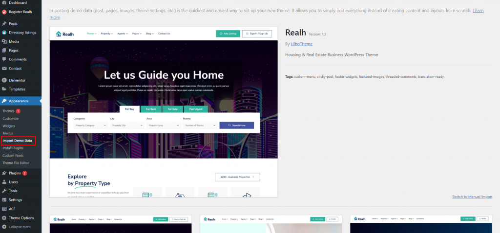 ** Note: Before proceeding, please remember that when you are done with the demo import, all existing settings and contents will be removed and replaced by the demo contents. So it is highly recommended that you should only do this in fresh site. **
